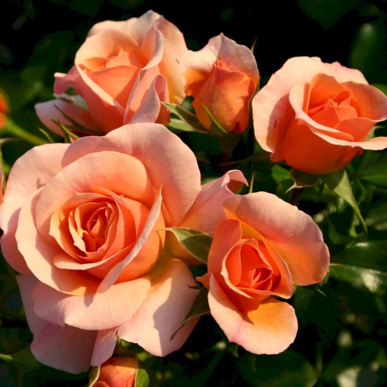 Abrikos med rosa noter. Halvfyldt blomst med let duft. 15-25 kronblade. 7-9 cm i diameter.