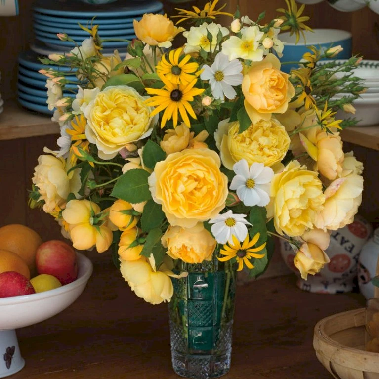 Blød æggeblommegul i knop, som udsprunget lysere og med ferskenfarvede noter hen mod afblomstringen. Stor, velformet fyldt blomst med kraftig og dejlig, frugtagtig duft. Over 40 kronblade. Op til 15 cm i diameter.