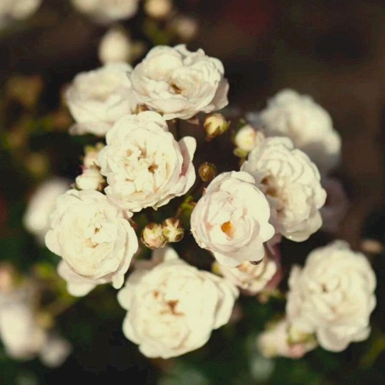 Små, cremehvide til rent hvide blomster, 15-25 kronblade. 5-8 cm. i diameter.