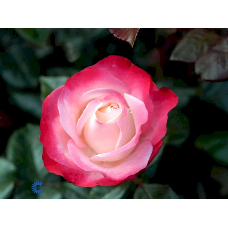 Tofarvet kirsebærrød og flødehvid. Stor, velformet fyldt blomst med let duft. 20-25 kronblade. Op til 10 cm i diameter.