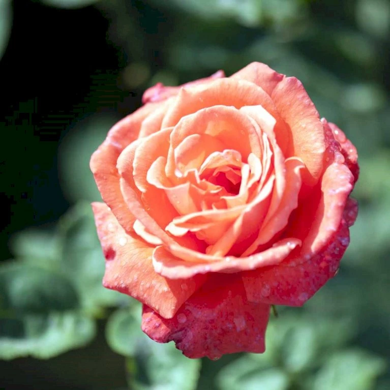 Cinnoberrød i knop, den åbne blomst er lysende orange til laks. Stor, velformet fyldt blomst med kraftig og dejlig duft, der minder om hindbær. 25-40 kronblade. Op til 12 cm i diameter.